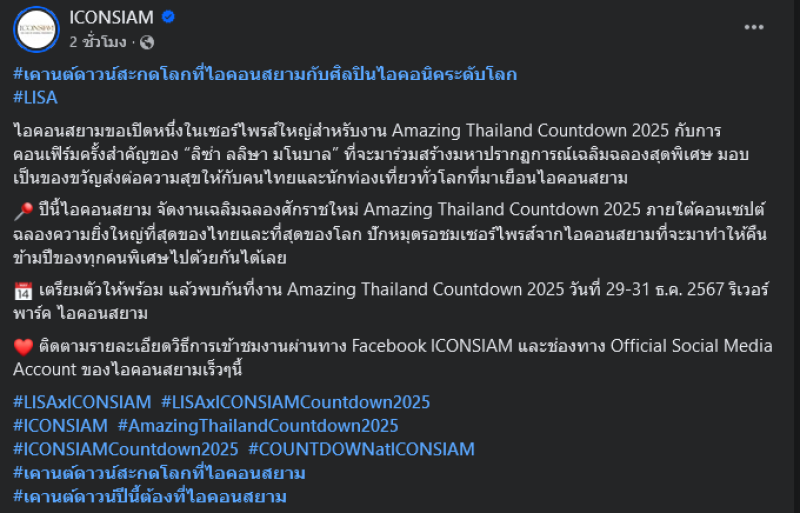 เรียกได้ว่าทำเอาแฟนๆต่างพากันเฮลั่นเลยทีเดียวเมื่อล่าสุด ไอคอนสยาม ได้โพสต์ประกาศข่าวดีว่า #เคานต์ดาวน์สะกดโลกที่ไอคอนสยามกับศิลปินไอคอนิคระดับโลก #LISA ไอคอนสยามขอเปิดหนึ่งในเซอร์ไพรส์ใหญ่สำหรับงาน Amazing Thailand Countdown 2025 กับการคอนเฟิร์มครั้งสำคัญของ ลิซ่า ลลิษา มโนบาล