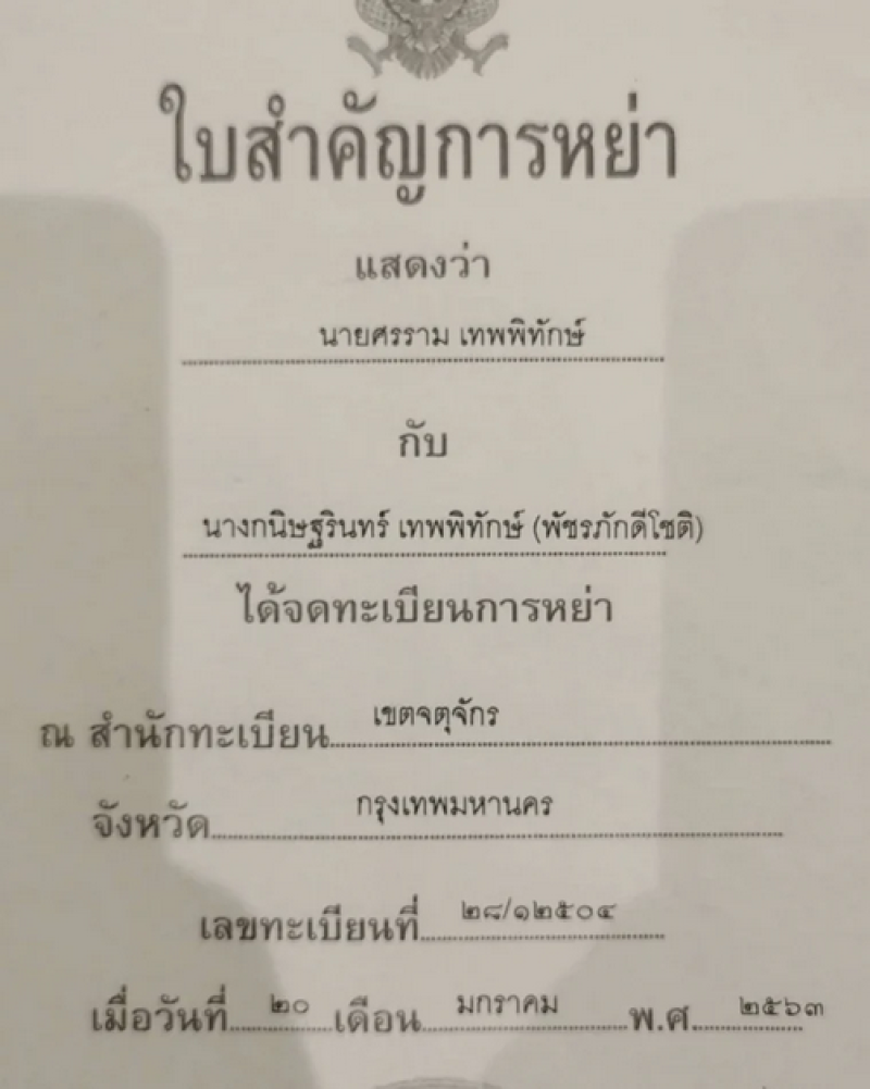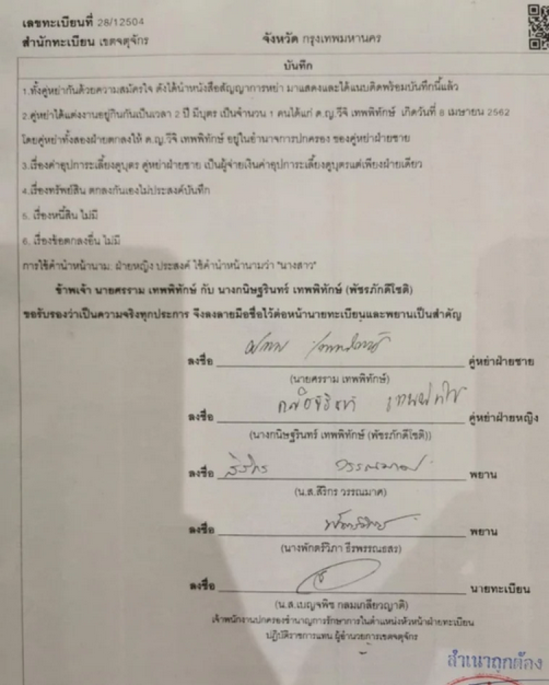 1.ทั้งคู่หย่ากันด้วยความสมัครใจ ดังได้นำหนังสือสัญญาการหย่า มาแสดงและได้แนบติดพร้อมบันทึกนี้แล้ว