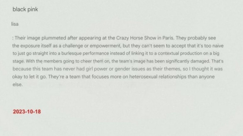 โดยในเอกสารยังระบุว่า HYBE มองว่าการปรากฏตัวของลิซ่าที่ Crazy Horse Show ส่งผลกระทบต่อภาพลักษณ์ของเธอในสายตาสาธารณชน โดยแสดงให้เห็นว่าการแสดงที่มีเนื้อหาเซ็กซี่นี้ไม่ได้เชื่อมโยงกับบริบทศิลปะที่ชัดเจน ทำให้ถูกวิจารณ์ว่าเป็นการแสดงที่ขาดความลึกซึ้ง ดูเหมือนเป็นการล้อเลียนที่ไร้เดียงสา และภาพลักษณ์ของวง BLACKPINK โดยรวมก็ได้รับผลกระทบไปด้วย