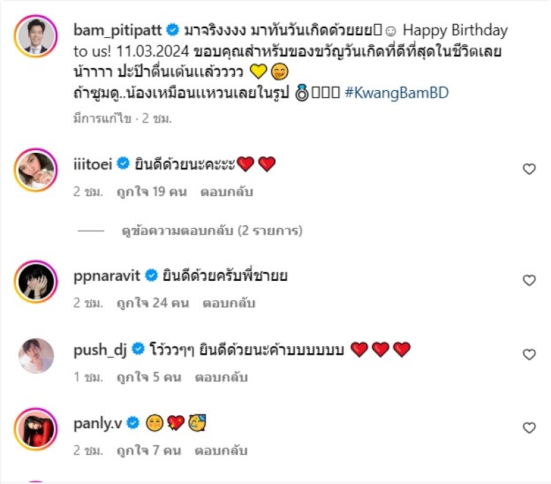 เรียกได้ว่า เป็นคู่รักที่คบหากันยาวนาน อย่างพิธีกรและผู้ประกาศข่าว แบม ปีติภัทร กับแฟนสาว กวาง ช้องมาศ นักแสดงสาวสวย ซึ่งทั้งคู่ได้เข้าพิธีแต่งงานแล้ว ล่าสุดได้ออกมาประกาสข่าวดีแล้ว ผ่านทางอินสตาแกรม พร้อมระบุข้อความว่า มาจริงงงง มาทันวันเกิดด้วยยย Happy Birthday to us! 11.03.2024 ขอบคุณสำหรับของขวัญวันเกิดที่ดีที่สุดในชีวิตเลยน้าาาา ปะป๊าตื่นเต้นเเล้วววว ถ้าซูมดู..น้องเหมือนเเหวนเลยในรูป #KwangBamBD