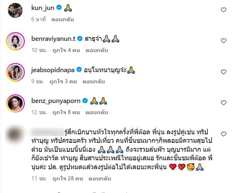 เรียกได้ว่า เป็นนางเอกสายบุญ อย่าง นุ่น วรนุช และสามี ต๊อด ปิติ ซึ่งล่าสุดนุ่นได้ไปทำบุญทอดกฐินประจำปี กราบนมัสการหลวงปู่ศิลา โดยได้เผยผ่านทางอินสตาแกรม พร้อมระบุข้อความว่า บุญมหากฐินประจำปี 2567 ณ วัดพระธาตุหมื่นหิน อ.เขาวง จ.กาฬิสินธุ์ รวมเงินกฐินยอดเศรษฐี ถวาย 26,460,020.50 บาท ยอดกฐิน วัดพระธาตุหมื่นหิน 2567 89,761,367.05บาท สามสิงห์อมูเลท อามะภัณเต ทับทิม วรา ขุนแผน หวานเจี๊ยบ และสาธุชนคณะศิษย์หลวงปู่ศิลา อนุโมทนาสาธุบุญกับทุกท่านด้วยค่ะ