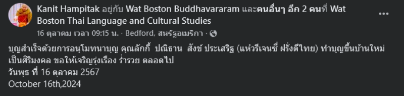 โดยเขียนข้อความว่า บุญสำเร็จด้วยการอนุโมทนาบุญ คุณลักกี้ ปณิธาน สังข์ ประเสริฐ (แห๋วรีเจนซี่ ฝรั่งดีไทย) ทำบุญขึ้นบ้านใหม่เป็นศิริมงคล ขอให้เจริญรุ่งเรือง ร่ำรวย ตลอดไป วันพุธ ที่ 16 ตุลาคม 2567 October 16th,2024