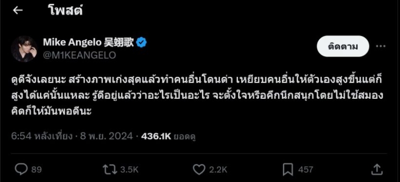 เรียกได้ว่าทำเอาแฟนๆต่างพากันสงสัยหนักมากว่าเกิดอะไรขึ้นเมื่อนักร้อง-นักแสดงหนุ่ม ไมค์ พิรัชต์ ได้ออกมาโพสต์ข้อความผ่านX ฟาดสุดแรงถึงใครบางคน โดยเขียนข้อความว่า
