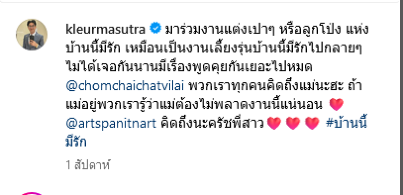 โดยเขียนแคปชั่นว่า มาร่วมงานแต่งเปาๆ หรือลูกโป่ง แห่งบ้านนี้มีรัก เหมือนเป็นงานเลี้ยงรุ่นบ้านนี้มีรักไปกลายๆ ไม่ได้เจอกันนานมีเรื่องพูดคุยกันเยอะไปหมด พวกเราทุกคนคิดถึงแม่นะฮะ ถ้าแม่อยู่พวกเรารู้ว่าแม่ต้องไม่พลาดงานนี้แน่นอน คิดถึงนะครัชพี่สาว #บ้านนี้มีรัก