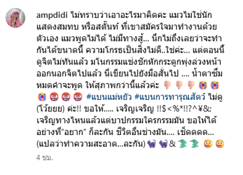 นึกไม่ถึงเลยว่าจะทำกันได้ขนาดนี้ ความโกรธเป็นสิ่งไม่ดี..ใช่ค่ะ... แต่ตอนนี้ดูจิตไม่ทันแล้ว มโนกรรมแช่งชักหักกระดูกพุ่งล่วงหน้า ออกนอกจิตไปแล้ว นี่เขียนไปยังมือสั่นไป .... น้ำตาซึม หมดคำจะพูด ให้สุภาพกว่านี้แล้วค่ะ #แบนแม่หยัว #แบนการทารุณสัตว์ ไม่ดู(โว้ยยย) ค่ะ!! ขอให้..... เจริญเจริญ เจริญทางไหนแล้วแต่บาปกรรมใครกรรมมัน ขอให้ได้อย่างที่"อยาก" ก็ละกัน ชีวิตอื่นช่างมัน.... เช็ดดดด...(แปลว่าทำความสะอาด...ละกัน)