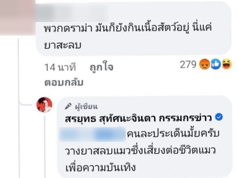 ล่าสุด มีชาวเน็ตรายหนึ่งแสดงความคิดเห็นในเพจ สรยุทธ สุทัศนะจินดา กรรมกรข่าว บอกว่า พวกดราม่า มันก็ยังกินเนื้อสัตว์อยู่ นี่แค่ยาสลบ งานนี้ทางด้าน สรยุทธ จึงรีบตอบกลับคอมเมนต์ทันทีว่า คนละประเด็นมั้ยครับ วางยาสลบแมว ซึ่งเสี่ยวต่อชีวิตแมวเพื่อความบันเทิง