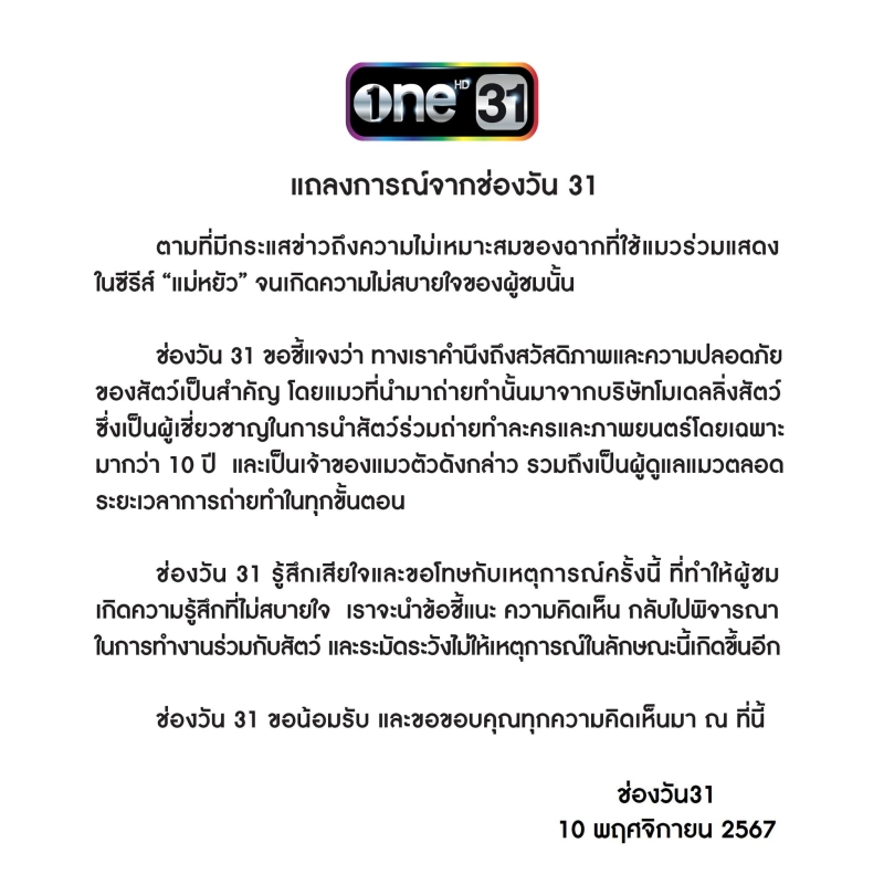 จากประเด็นดราม่าละครเเม่หยัว ที่ตอนนี้กำลังเป็นกระเเสดราม่าหนักมากล่าสุดทางด้านช่องวัน 31 ได้โพสต์แถลงการณ์ชี้เเจงเเล้วว่า แถลงการณ์จากช่องวัน 31 ตามที่มีกระเเสข่าวถึงความไม่เหมาะสมของฉากที่ใช้เเมวร่วมแสดงในซีรีส์ แม่หยัว จนเกิดความไม่สบายใจของผู้ชมนั้น ช่องวัน 31 ขอชี้เเจงว่า ทางเราคำนึงถึงสวัสดิภาพและความปลอดภัยของสัตว์เป็นสำคัญ