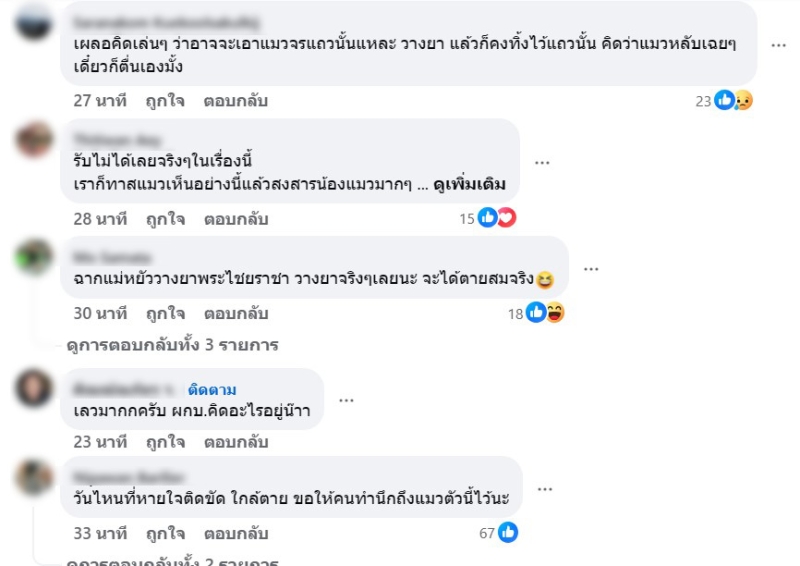 งานนี้จึงทำให้มีชาวเน็ตเข้ามาคอมเมนต์กันถล่มทลาย แต่เรื่องนี้แมวนั้นตายจริงหรือไม่นั้น เราไม่สารารถทราบได้เลย โปรดใช้วิจารณญาณในการอ่านนะคะ