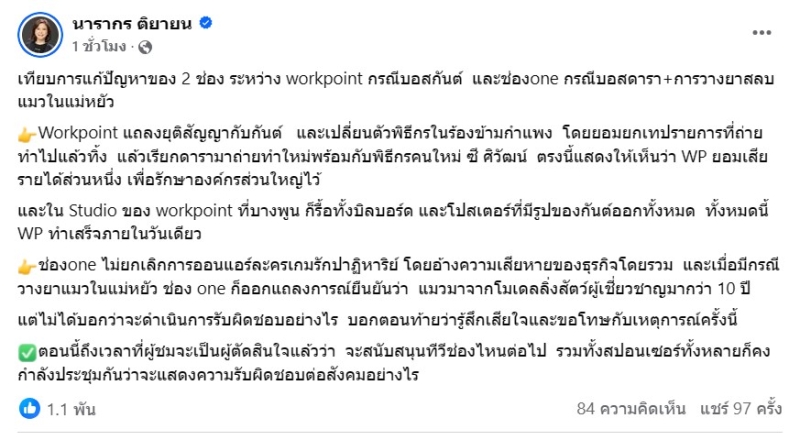 โดยทางคุณ นารากร ติยายน เป็นอีกบุคคลหนึ่ง ที่เลี้ยงสัตว์และชอบออกมาโพสต์ช่วยเหลือสัตว์อยู่บ่อย ล่าสุดได้ออกมาเปรียบเทียบให้ชาวเน็ตได้เห็นเลยว่า 2 ช่องใหญ่มีการแก้ไขปัญหากันอย่างไร โดยได้โพสต์ว่า เทียบการแก้ปัญหาของ 2 ช่อง ระหว่าง workpoint กรณีบอสกันต์ และช่องone กรณีบอสดารา+การวางยาสลบแมวในแม่หยัว