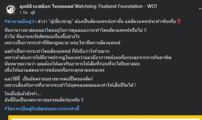 หัวหน้าฝ่ายกฎหมาย มูลนิธิวอชด็อก ไทยแลนด์ ระบุอีกว่า ส่วนตัวมองอาการของแมวที่ขย้อนอาหารและกระตุกก่อนแน่นิ่งไป เกิดขึ้นจากความตั้งใจที่ต้องการให้สัตว์แสดงอาการแบบนั้น มากกว่าจะเป็นความผิดพลาดในกระบวนการอดอาหารหรือไม่