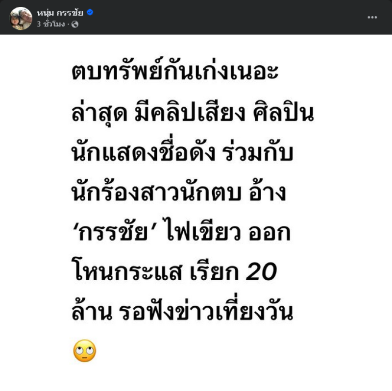 จากประเด็นร้อนแรงที่ หนุ่ม กรรชัย ได้ออกมาโพสต์ข้อความเป็นปริศนาหลังถูกแอบอ้างชื่อ และรายการโหนกระแส พร้อมกับเผยคลิปเสียง ศิลปิน-นักแสดงชื่อดัง ร่วมกับนักร้องสาวนักตบ เรียก 20 ล้านบาท โดยพาดพิงชื่อก็คือ ฟิล์ม รัฐภูมิ