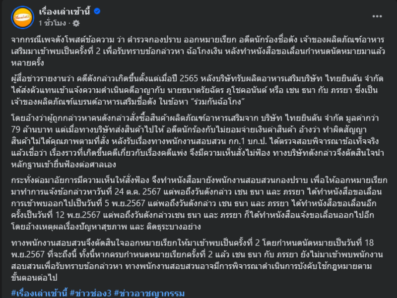 อีกหนึ่งอดีตนักร้องดังสำหรับ เชน ธนา หรือ เชน ธนาตรัยฉัตร ภูโชคอนันต์ เจ้าของผลิตภัณฑ์อาหารเสริม ที่ถูกตำรวจออกหมายเรียกเพื่อรับทราบข้อกล่าวหา ฉ้อโกงเงิน โดยอีกฝ่ายได้เลื่อนนัดมาแล้วครั้งหนึ่ง ล่าสุดทางด้านเพจ เรื่องเล่าเช้านี้ ได้ออกมาโพสต์ว่า