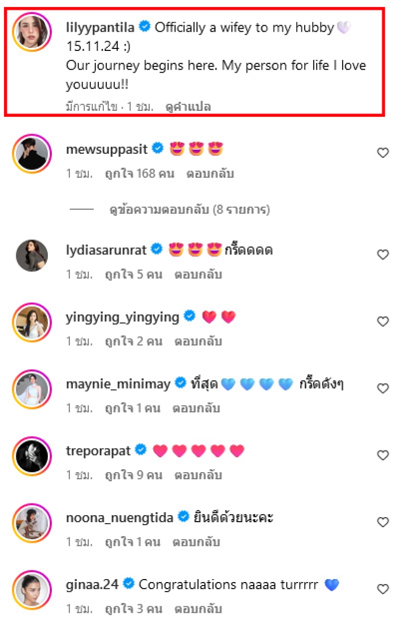 โดยทั้งคู่บอกว่าฤกษ์แต่งน่าจะไม่เกินปีหน้า ทั้งนี้ ลิลลี่ ยังได้โพสต์ภาพขณะจดทะเบียนสมรสใน อินสตาแกรม ส่วนตัว พร้อมกับแคปชั่นว่า Officially a wifey to my hubby Our journey begins here. My person for life I love youuuuu!!
