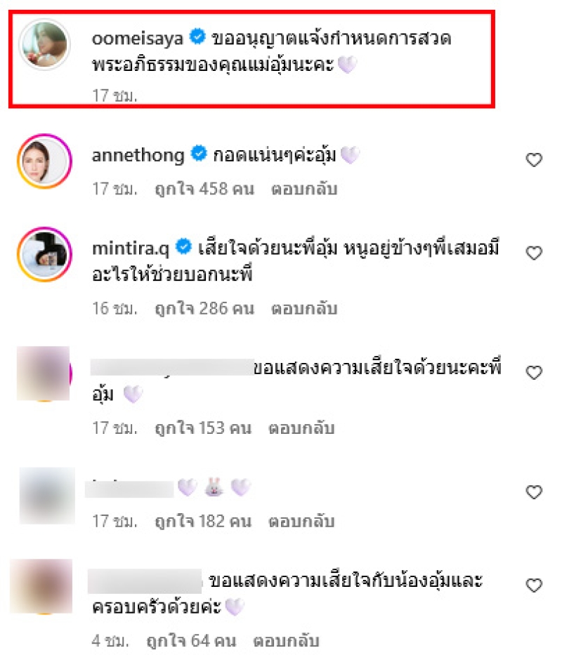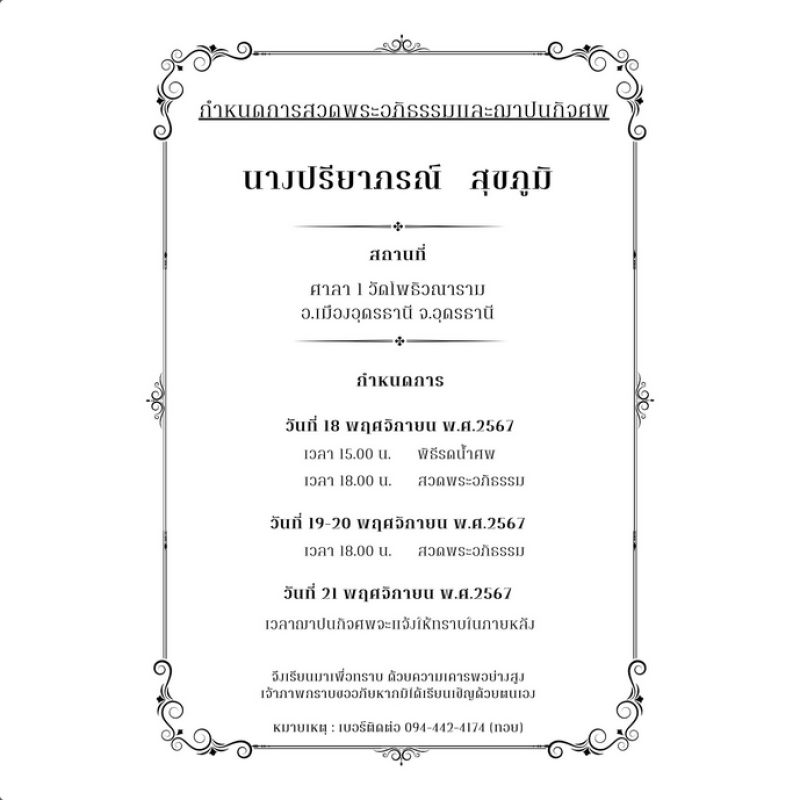 โดยระบุข้อความเอาไว้ว่า ขออนุญาตแจ้งกำหนดการสวดพระอภิธรรมของคุณแม่อุ้มนะคะ ซึ่งจะมีการสวดพระอภิธรรม และจะจัดที่ศาลา 1 วัดโพธิวณาราม อำเภอเมือง จังหวัดอุดรธานี ระหว่างวันที่ 18-21 พฤศจิกายน 2567 นี้ ท่ามกลางแฟนๆเเละเพื่อนในวงการร่วมส่งกำลังใจให้อย่างมาก