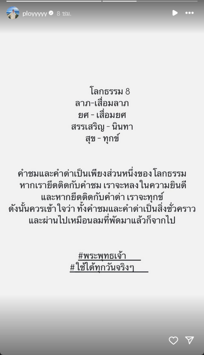 ปมแฮชแท็ก #ช่อง3ทรีตนสดหญิงให้เท่าเทียม ล่าสุด พี่พลอย ผู้จัดการส่วนตัวของเบลล่า ก็มีความเคลื่อนไหวทาง อินสตาแกรม ก็ออกมา โดยเป็นคำคมธรรมะโลกธรรม8 โดยเขียนว่า