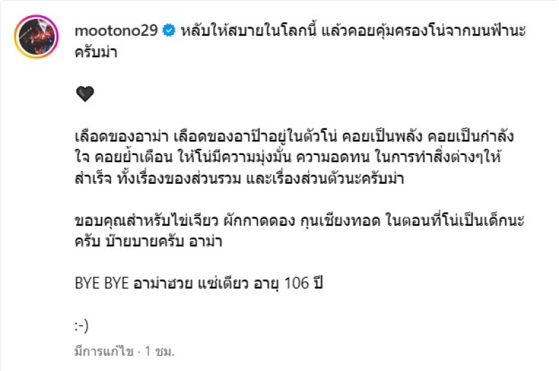 ขอบคุณสำหรับไข่เจียว ผักกาดดอง กุนเชียงทอด ในตอนที่โน่เป็นเด็กนะครับ บ๊ายบายครับ อาม่า BYE BYE อาม่าฮวย แซ่เตียว อายุ 106 ปี