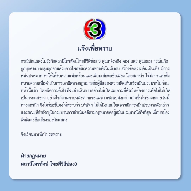 ทางสถานีฯ จึงใคร่ขอชี้แจงให้ทราบว่า บริษัทฯ ไม่ได้นิ่งนอนใจต่อกรณีการหมิ่นประมาทดังกล่าวและขณะนี้กำลังอยู่ในกระบวนการดำเนินคดีตามกฎหมายต่อผู้หมิ่นประมาทให้ถึงที่สุด เพื่อปกป้องสิทธิและชื่อเสียงของนักแสดง