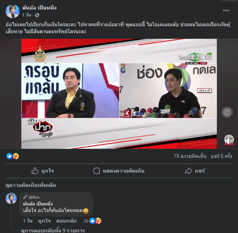 งานทำเอาคุณต้นอ้อ ได้ออกมาชี้แจงผ่านเฟซบุ๊ค ต้นอ้อ เป็นหนึ่ง บอกว่า อ้อไม่เคยไปเรียกเก็บเงินใครนะคะ ไปหาคนที่จ่ายอ้อมาที พูดแบบนี้ ไม่โอเคเลยเด้อ ช่วยคนไม่เคยเรียกเงินผู้เสียหาย ไม่มีสันดานตบทรัพย์ใครนะคะ , เสียใจ อะไรก็ต้นอ้อโดนหมด