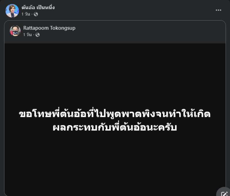 ในขณะที่ด้านฟิล์ม ออกมาโพสต์ขอโทษบอกว่า ขอโทษพี่ต้นอ้อที่ไปพูดพาดพิงจนทำให้เกิดผลกระทบกับพี่ต้นอ้อนะครับ ด้านคุณต้นอ้อก็ได้แชร์โพสต์หนุ่มฟิล์มด้วย