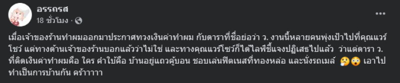 เมื่อเจ้าของร้านทำผมออกมาประกาศทวงเงินค่าทำผม กับดาราที่ชื่อย่อว่า ว. งานนี้หลายคนพุ่งเป้าไปที่คุณแวร์โซว์ แต่ทางด้านเจ้าของร้านบอกแล้วว่าไม่ใช่ และทางคุณแวร์โซว์ก็ได้ไลฟ์ชี้แจงปฏิเสธไปแล้ว ว่าแต่ดารา ว. ที่ติดเงินค่าทำผมคือ ใคร คำใบ้คือ บ้านอยู่แถวคู้บอน ชอบเล่นฟิตเนสที่ทองหล่อ และนั่งรถเมล์ เอาไปทำเป็นการบ้านกัน คร้าาาาา