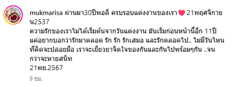 ผ่านมา30ปีพอดี ครบรอบแต่งงานของเรา21พฤศจิกายน2537 ความรักของเราไม่ได้เริ่มต้นจากวันแต่งงาน มันเริ่มก่อนหน้านี้อีก 11ปี แค่อยากบอกว่ารักมาตลอด รัก รัก รักเสมอ และรักตลอดไป.. ไม่มีวันไหนที่คิดจะปล่อยมือ เราจะเยียวยาจิตใจของกันและกันไปพร้อมๆกัน ..จนกว่าจะหายสนิท 21พย.2567