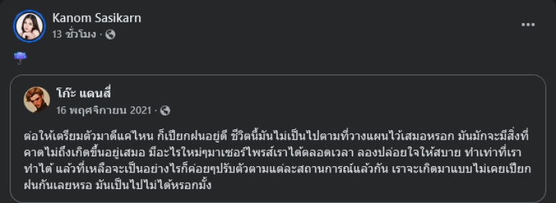 ล่าสุดทางด้าน ขนม ศศิกานต์ ได้เคลื่อนไหวล่าสุดโดยการแชร์โพสต์ที่มีข้อความที่ว่า ต่อให้เตรียมตัวมาดีแค่ไหน ก็เปียกฝนอยู่ดี ชีวิตนี้มันไม่เป็นไปตามที่วางแผนไว้เสมอหรอก มันมักจะมีสิ่งที่คาดไม่ถึงเกิดขึ้นอยู่เสมอ มีอะไรใหม่ๆมาเซอร์ไพรส์เราได้ตลอดเวลา