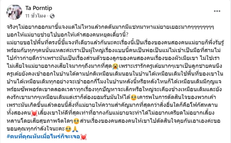 ไม่ใช่เราไม่เสียใจแม่ยายอากงเสียใจมากๆถึงมากที่สุด เพราะเรารักครูเต้ยมากๆเขาเป็นลูกชายคนนึงครูเต้ยยังคงเข้าออกในบ้านใด้ตามปกติเหมือนเดิม นอนในบ้านได้เหมือนเดิม ใช้พื้นที่ของเขาในบ้านได้เหมือนเดิมทุกอย่าง จะเข้าออกกี่โมงในบ้านหลังนี้หรือหลังไหนก็ได้เหมือนเดิม มีกุญแจ พร้อมซัพพอร์ตเขาตลอดเวลา ทุกเรื่องทุกปัญหาจะเล็กหรือใหญ่จะเคียงข้างเหมือนเดิมและยังคงรักเขามากๆเหมือนเดิม... อ่านข่าวต้นฉบับได้ที่ : https://www.khaosod.co.th/entertainment/news_9516188