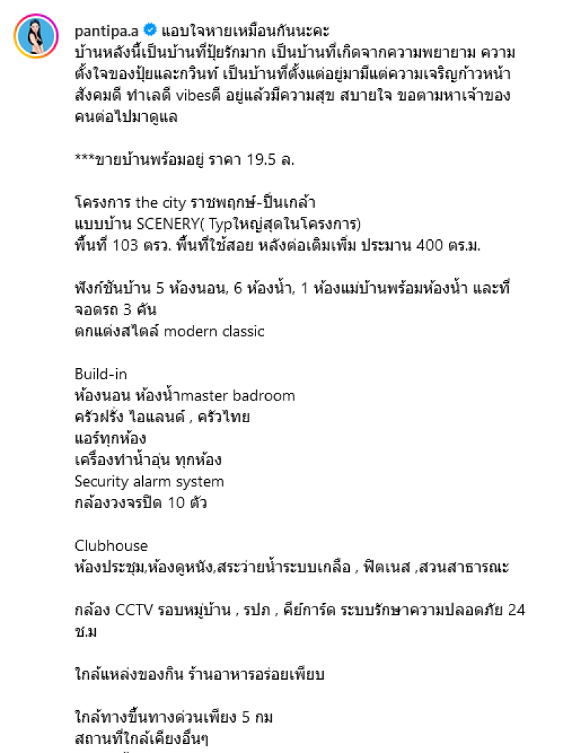 โดยประกาศขายว่า แอบใจหายเหมือนกันนะคะ บ้านหลังนี้เป็นบ้านที่ปุ้ยรักมาก เป็นบ้านที่เกิดจากความพยายาม ความตั้งใจของปุ้ยและกวินท์ เป็นบ้านที่ตั้งแต่อยู่มามีแต่ความเจริญก้าวหน้า สังคมดี ทำเลดี vibesดี อยู่แล้วมีความสุข สบายใจ ขอตามหาเจ้าของคนต่อไปมาดูแล ขายบ้านพร้อมอยู่ ราคา 19.5 ล. โครงการ the city ราชพฤกษ์-ปิ่นเกล้า แบบบ้าน SCENERY( Typใหญ่สุดในโครงการ)
