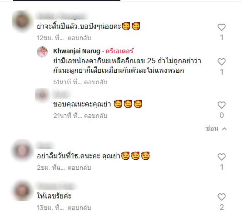 ล่าสุด ทางคุณย่าเปิ้ลได้เผยคลิปลงช่องTikTok @hwanjainarug1 เป็นคลิปตัวเองกำลังร้องเพลง และได้มีแฟนคลับคนหนึ่งเข้ามาคอมเมนต์ว่า ย่าจะสิ้นปีแลัว.ขอปังๆน่อยค่ะ และด้านย่าเปิ้ลได้กลับว่า ย่ามีเลขน้องคากินะเหลืออีกเลข 25 ถ้าไม่ถูกอย่าว่ากันนะลูกย่าก็เสียเหมือนกันตัวละไม่แพงหรอก