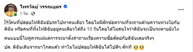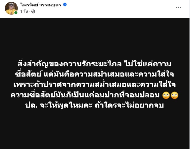 เรียกได้ว่า เป็นบุคคลที่มีชื่อเสียง อย่าง ไพรวัลย์ วรรณบุตร ที่ก่อนหน้านั้น ได้จบความสัมพันธ์กับแฟนหนุ่มลง และก่อนหน้านั้น ก็เหมือนจะเปิดตัวแฟนหนุ่มคนใหม่ ล่าสุดทาง ไพรวัลย์ ได้โพสต์รัวๆ จะเกี่ยวกับความสัมพันธ์ล่าสุดไหม โดยได้ระบุข้อความว่า สิ่งสำคัญของความรักระยะไกล ไม่ใช่แค่ความซื่อสัตย์ แต่มันคือความสม่ำเสมอและความใส่ใจ เพราะถ้าปราศจากความสม่ำเสมอและความใส่ใจ ความซื่อสัตย์มันก็เป็นแค่ลมปากที่จอมปลอม ปล. จะให้พูดไหมคะ ถ้าใครจะไม่อยากจบ