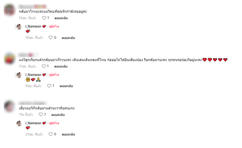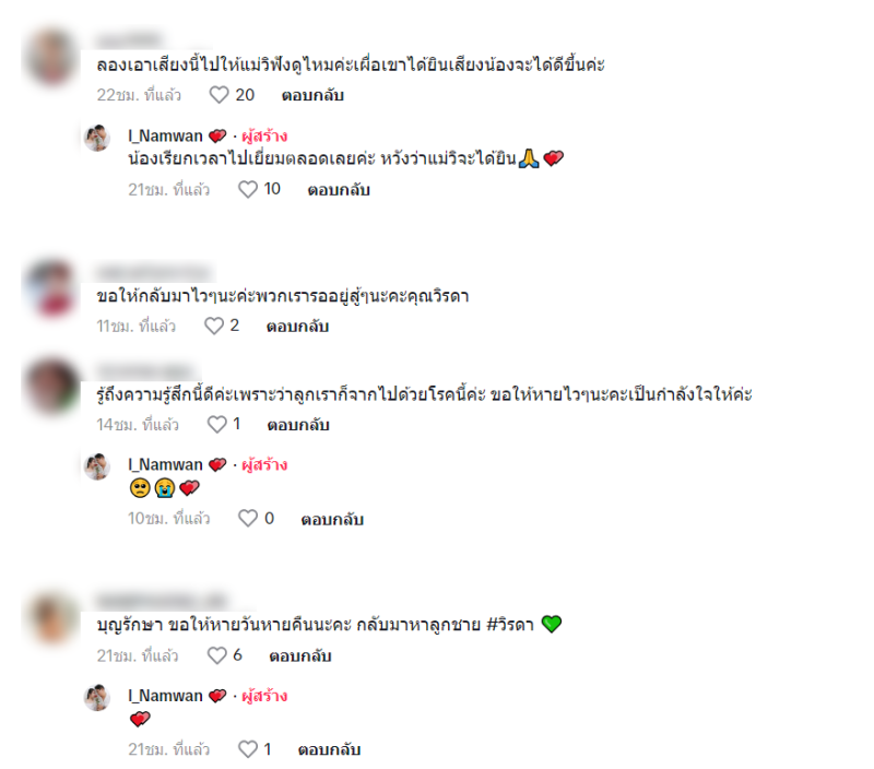 ท่ามกลาง ชาวเน็ตก็ได้เข้ามาแนะนำให้ไปทำบุญที่ต่างๆและก็มีหลายคนเข้ามาให้กำลังใจกัน ทางทีมข่าวขอส่งกำลังใจอีกแรงให้ วิ-วิรดา วงศ์เทวัญ น้องสาว กุ้ง-สุธิราช หายป่วยเร็วๆ