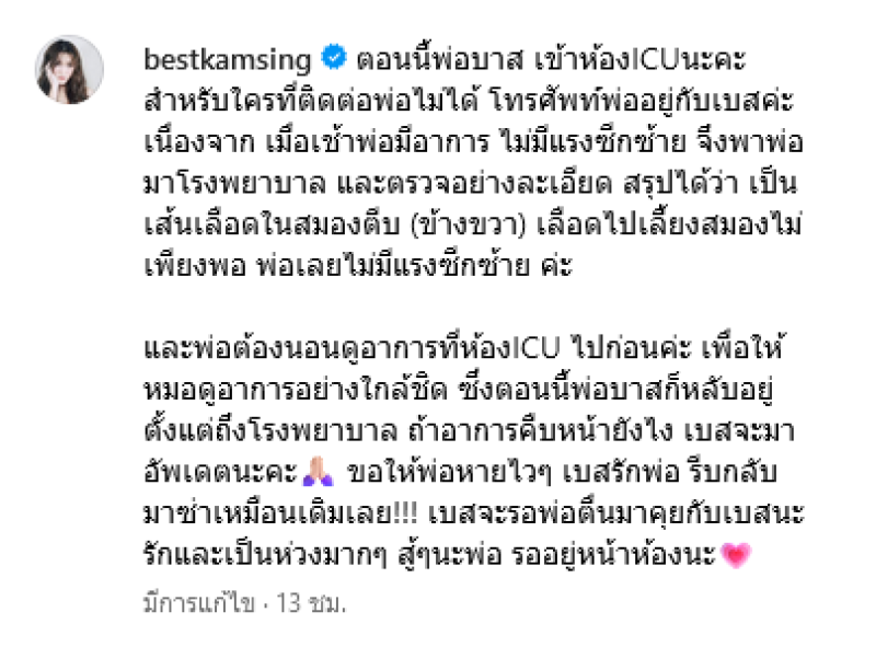สรุปได้ว่า เป็นเส้นเลือดในสมองตีบ (ข้างขวา) เลือดไปเลี้ยงสมองไม่เพียงพอ พ่อเลยไม่มีแรงซีกซ้าย ค่ะ และพ่อต้องนอนดูอาการที่ห้องICU ไปก่อนค่ะ เพื่อให้หมอดูอาการอย่างใกล้ชิด ซึ่งตอนนี้พ่อบาสก็หลับอยู่ตั้งแต่ถึงโรงพยาบาล ถ้าอาการคืบหน้ายังไง เบสจะมาอัพเดตนะคะ ขอให้พ่อหายไวๆ เบสรักพ่อ รีบกลับมาซ่าเหมือนเดิมเลย!!! เบสจะรอพ่อตื่นมาคุยกับเบสนะ รักและเป็นห่วงมากๆ สู้ๆนะพ่อ รออยู่หน้าห้องนะ