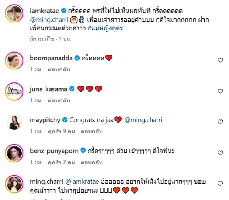 โดยทาง กระแต ศุภสร เพื่อนซี้คนสนิท ได้โพสต์แสดงความยินดีกับ หมิง พร้อมระบุข้อความว่า กรี๊ดดดด พรที่ให้ไปเห็นผลทันที กรี๊ดดดดดด @ming.charri เพื่อนเจ้าสาวรออยู่ค้าบบบ กุดีใจมากกกกก ฝากเพื่อนกระแตด้วยค่าาา #แม่หญิงอุดร