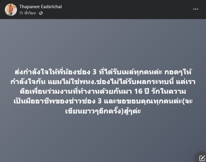 ล่าสุด แยม ฐปณีย์ โพสต์เฟสบุ๊กThapanee Eadsrichai ระบุข้อความส่งกำลังใจบอกว่า ส่งกำลังใจให้พี่น้องช่อง 3 ที่ได้รับเมล์ทุกคนค่ะ กอดๆให้กำลังใจกัน แยมไม่ใช่พนง.ช่องไม่ได้รับผลกระทบนี้ แต่เราคือเพื่อนร่วมงานที่ทำงานด้วยกันมา 16 ปี รักในความเป็นมืออาชีพของช่าวช่อง 3 และขอขอบคุณทุกคนค่ะ(จะเขียนยาวๆอีกครั้ง)สู้ๆค่ะ