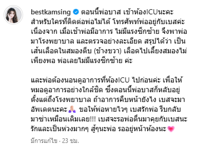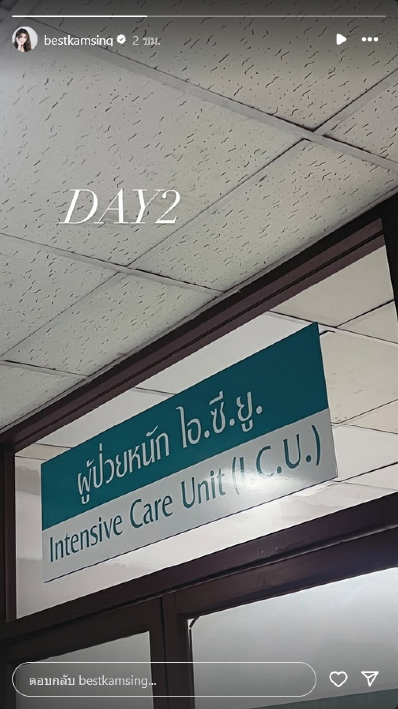 สรุปได้ว่า เป็นเส้นเลือดในสมองตีบ (ข้างขวา) เลือดไปเลี้ยงสมองไม่เพียงพอ พ่อเลยไม่มีแรงซีกซ้าย ต้องนอนดูอาการที่ห้องICU ไปก่อน ล่าสุด เบสท์ ได้เคลื่อนไหวอีกครั้ง โดยโพสต์ภาพขณะอยู่หน้าห้อง ICU พร้อมกับเขียนข้อความว่า DAY2