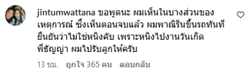 ซึ่งทางด้าน หนิง ปณิตา ได้ออกมาโพสต์ยืนยันเเล้วว่าตัวเองไม่ใช่คนที่ตบกันกลางที่จอดรถ เพราะเวลาที่เกิดเรื่องนั้นตนได้ไปงานวันเกิดรุ่นพี่ โดยอดีตสามีอย่าง จิน จรินทร์ ได้เข้ามาคอมเมนต์ในโพสต์ของ หนิง ปณิตา ว่า ขอพูดนะ ผมเห็นในบางส่วนของเหตุการณ์ ซึ่งเห็นตอนจบแล้ว ผมพาณิรินขึ้นรถทันที ยืนยันว่าไม่ใช่หนิงคับ เพราะหนิงไปงานวันเกิดพี่ธัญญ่า ผมไปรับลูกให้ครับ