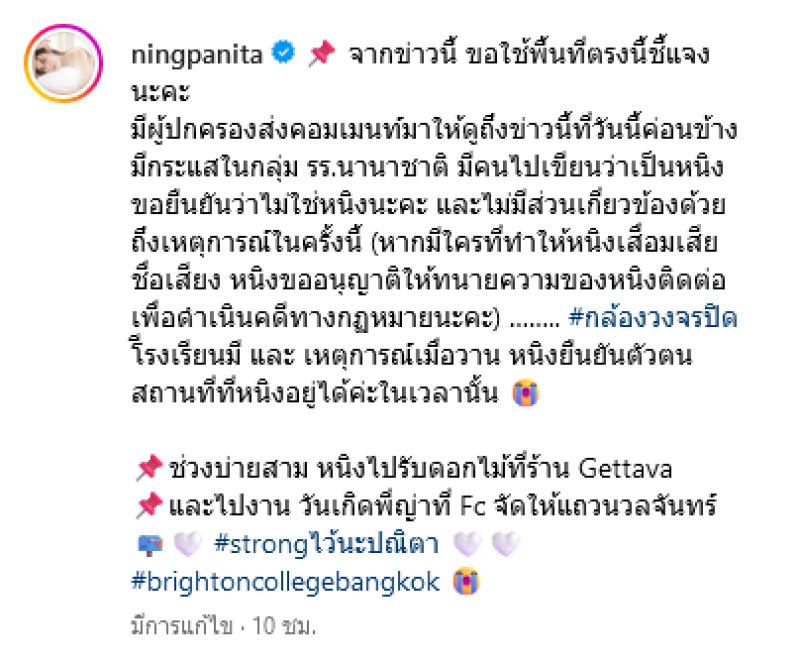 จากกรณีที่ก่อนหน้านี้ได้มีประเด็นร้อนของทางโรงเรียนได้โยงมาทาง หนิง ปณิตา โดยได้โพสต์ข้อความว่า โรงเรียน Top Tier ค่าเทอมปีละเกือบล้าน ผปค.ดักตบกันกลางที่จอดรถใน ร.ร. เลือดตกยางออก เพิ่งย้ายมาเรียนเจออะไรแบบนี้ตกใจ อยากให้ ร.ร.มีมาตรการเชิญออกทั้งคู่ ไม่ใช่ตัวอย่างที่ดีของทั้งเด็กๆและสังคม "Kindness" ที่ ร.ร.พูดไว้เลย
