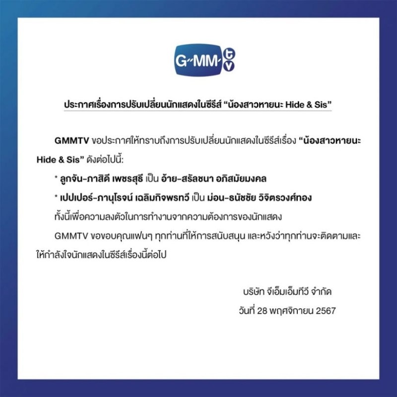 GMMTV ขอประกาศการปรับเปลี่ยนนักแสดงในซีรีส์ "น้องสาวหายนะ Hide & Sis" ดังนี้: