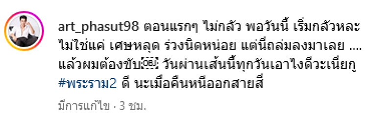 ล่าสุดทางด้านนักเเสดงหนุ่มอาร์ต พศุตม์ ได้ออกมาโพสต์ภาพพร้อมข้อความว่า ตอนแรกๆ ไม่กลัว พอวันนี้ เริ่มกลัวหละ ไม่ใช่แค่ เศษหลุด ร่วงนิดหน่อย แต่นี่ถล่มลงมาเลย .... แล้วผมต้องขับวันผ่านเส้นนี้ทุกวันเอาไงดีวะเนี่ย #พระราม2 ดี นะเมื่อคืนหนีออกสายสี่