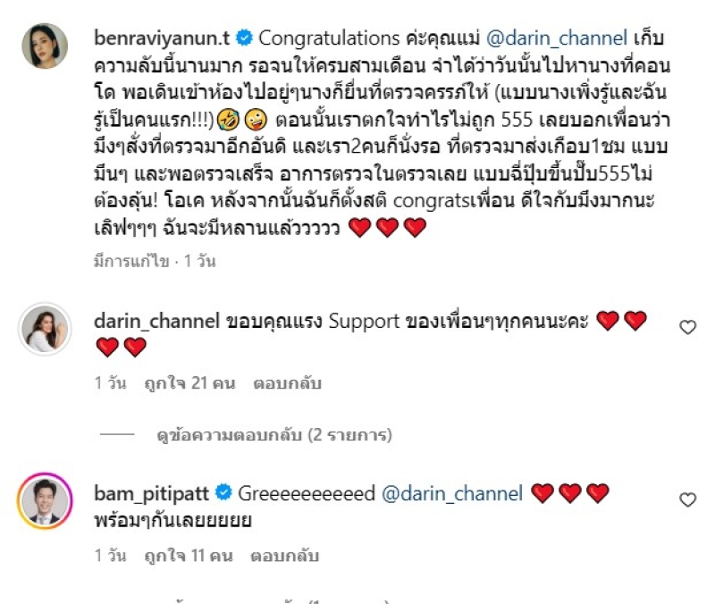 จำได้ไหมนักแสดง กวาง ดาริน แฮนเซน ที่เคยเล่นละคร สงครามนางงาม ที่หลายคนรู้จักกันดีในบทบาท เอย ซึ่งตอนนี้กลายเป็นนักแสดงอิสระแล้วนั้นเอง ล่าสุด เบญ เรวิญานันท์ เพื่อนคนสนิทของกวาง ได้เผยข่าวดีว่า Congratulations ค่ะคุณแม่ @darin_channel เก็บความลับนี้นานมาก รอจนให้ครบสามเดือน จำได้ว่าวันนั้นไปหานางที่คอนโด พอเดินเข้าห้องไปอยู่ๆนางก็ยื่นที่ตรวจครรภ์ให้ (แบบนางเพิ่งรู้และฉันรู้เป็นคนแรก!!!) ตอนนั้นเราตกใจทำไรไม่ถูก 555 เลยบอกเพื่อนว่ามึงๆสั่งที่ตรวจมาอีกอันดิ และเรา2คนก็นั่งรอ ที่ตรวจมาส่งเกือบ1ชม แบบมึนๆ และพอตรวจเสร็จ อาการตรวจในตรวจเลย แบบฉี่ปุ๊บขึ้นปั๊บ555ไม่ต้องลุ้น! โอเค หลังจากนั้นฉันก็ตั้งสติ congratsเพื่อน ดีใจกับมึงมากนะ เลิฟๆๆๆ ฉันจะมีหลานแล้ววววว
