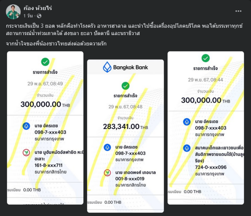ทั้งนี้ยังได้โพสต์แบ่งยอดบริจาคเป็น 3 ยอดว่า กระจายเงินเป็น 3 ยอด หลักคือทำโรงครัว อาหารฮาลาล และนำไปซื้อเครื่องอุปโภคบริโภค พอได้บรรเทาทุกข์ สถานการณ์น้ำท่วมภาคใต้ สงขลา ยะลา ปัตตานี และนราธิวาส จากน้ำใจของพี่น้องชาวไทยส่งต่อด้วยความรัก