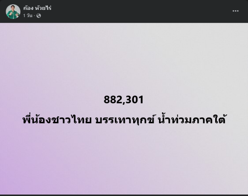 โดยก้อง ห่วยไร่ ได้เปิดบริจาคช่วยเหลือน้ำท่วมในครั้งนี้ด้วย ล่าสุด ก้อง ห้วยไร่ ได้เปิดจำนวนเงินยอดบริจาคบรรเทาทุกข์น้ำท่วมภาคใต้เป็นจำนวน 882,301 พี่น้องชาวไทย บรรเทาทุกข์ น้ำท่วมภาคใต้