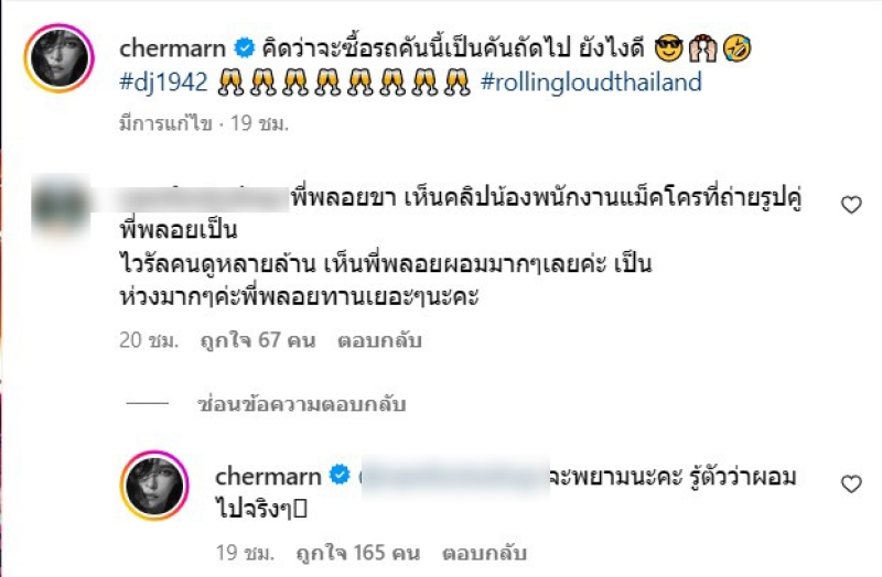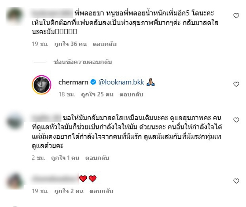 โดยในอินสตาแกรม พลอยได้โพสต์รูปลง และได้มีแฟนๆเข้ามาแสดงความคิดเห็นกันถึงอาการที่ผอมลง ด้านพลอยจึงได้ตอบกลับคอมเมนต์ว่า จะพยามนะคะ รู้ตัวว่าผอมไปจริงๆ