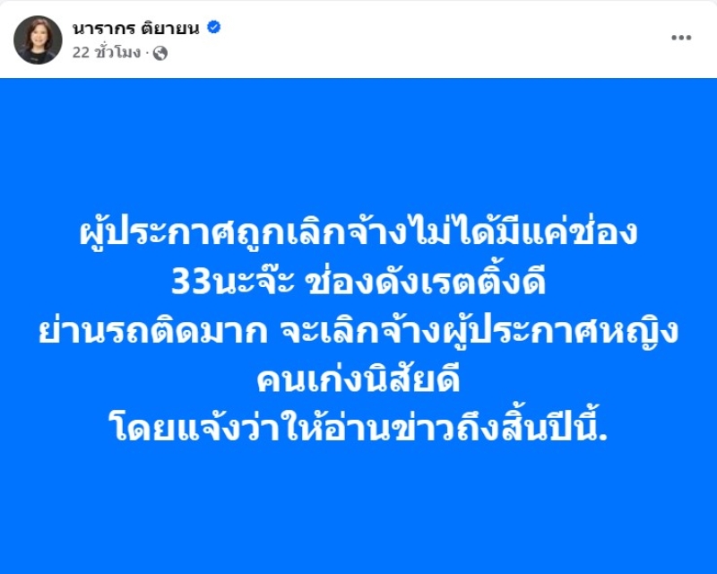 ล่าสุด ทาง ต๊ะ นารากร ได้ออกมาโพสต์เกี่ยวกับข่าวนี้เช่นกันว่า ผู้ประกาศถูกเลิกจ้างไม่ได้มีแค่ช่อง 33นะจ๊ะ ช่องดังเรตติ้งดี ย่านรถติดมาก จะเลิกจ้างผู้ประกาศหญิงคนเก่งนิสัยดี โดยแจ้งว่าให้อ่านข่าวถึงสิ้นปีนี้.