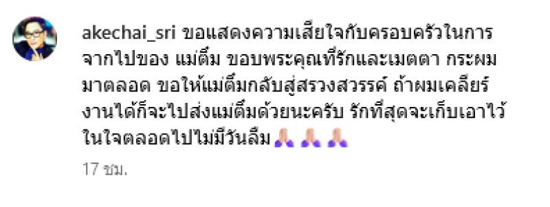 ทั้งนี้ เอกชัย ศรีวิชัย ได้โพสต์ข้อความว่า ขอแสดงความเสียใจกับครอบครัวในการจากไปของ แม่ติ๋ม ขอบพระคุณที่รักและเมตตา กระผมมาตลอด ขอให้แม่ติ๋มกลับสู่สรวงสวรรค์ ถ้าผมเคลียร์งานได้ก็จะไปส่งแม่ติ๋มด้วยนะครับ รักที่สุดจะเก็บเอาไว้ในใจตลอดไปไม่มีวันลืม
