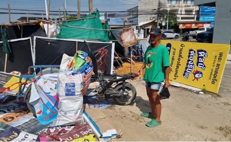 พอไปสร้างเพิงพักอาศัย และตระเวนเก็บของเก่าไปขายเพื่อหาเงินประทังชีวิต ก็ถูกเพื่อนบ้านเจ้าของที่ฟ้องเทศบาลขับไล่ที่มา จนกระทั่งมาเจอเจ้าของที่บริเวณนี้สงสารตน เพราะเห็นตนต้องตระเวนไปตากยุงริมถนน เลยอนุญาตให้ตนปลูกเพิงพักอาศัยในที่ดินบริเวณนี้ได้ ตนจึงตระเวนเก็บป้ายโฆษณา เศษไม้ วัสดุต่าง ๆ มาสร้างเป็นเพิงพักชั่วคราว อยู่แบบไม่มีน้ำไม่ไฟฟ้าใช้ หรือแม้แต่ห้องน้ำมาได้หนึ่งปีแล้ว