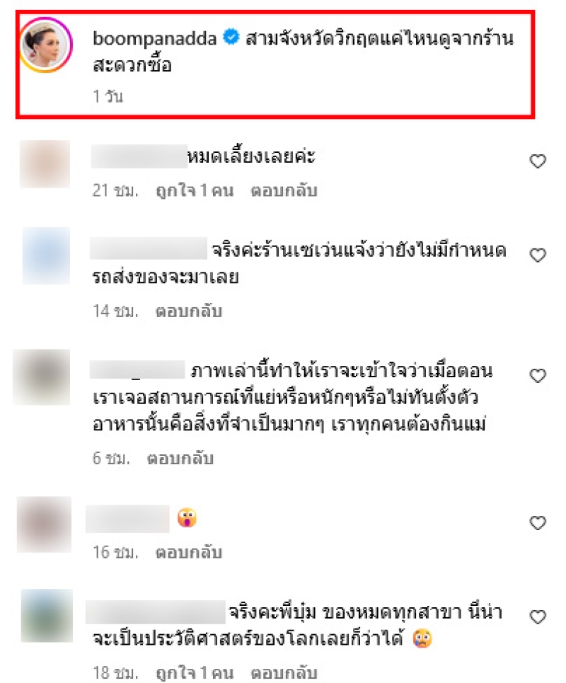 ล่าสุดบุ๋ม ปนัดดา ได้เผยภาพร้านสะดวกซื้อที่พบว่าของขายหมดเกลี้ยง พร้อมแคปชั่นระบุว่า สามจังหวัดวิกฤตแค่ไหนดูจากร้านสะดวกซื้อ ท่ามกลางชาวเน็ตเข้ามาคอมเมนต์กันอย่างมาก อาทิ หมดเลี้ยงเลยค่ะ,จริงค่ะร้านเซเว่นแจ้งว่ายังไม่มีกำหนดรถส่งของจะมาเลย,จริงค่ะพี่บุ๋ม ของหมดทุกสาขา นี่น่าจะเป็นประวัติศาสตร์ของโลกเลยก็ว่าได้ เป็นต้น