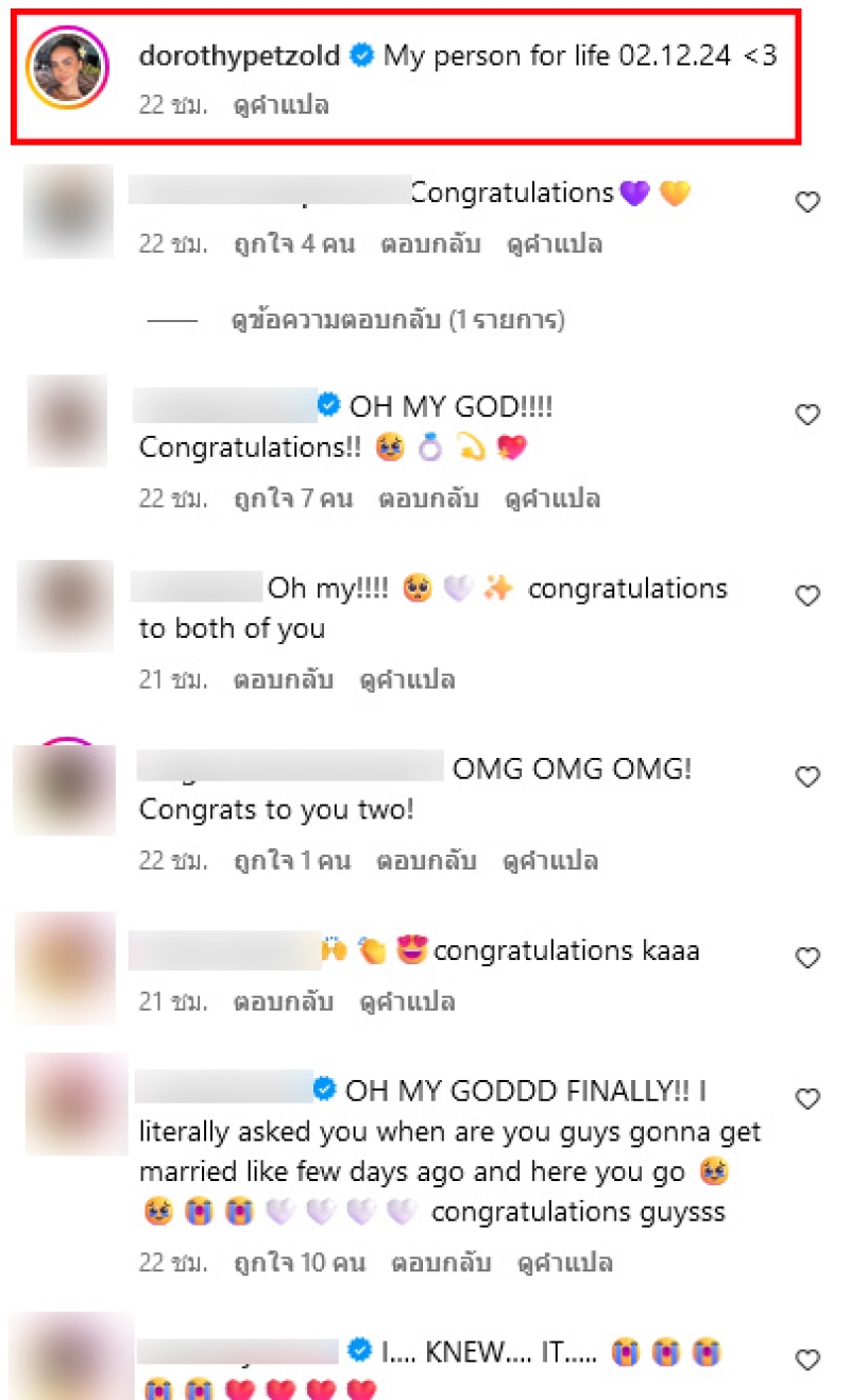 โดยทางด้าน โดโรธี เพ็ทโซลด์ ได้โพสต์ภาพโมเมนต์ขณะที่แฟนหนุ่มคุกเข่าขอแต่งงานริมทะเลผ่านอินสตาแกรมส่วนตัว พร้อมเขียนแคปชั่นว่า My person for life 02.12.24 3 ท่ามกลางแฟนๆเข้ามาคอมเมนต์กันอย่างมาก