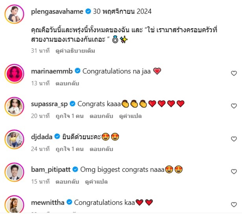 เรียกได้ว่า เป็นอีกหนึ่งดาราสาวที่ถูกขอแต่งงานแล้ว อย่าง หนูเพลง ชนม์ทิดา เป็นลูกสาวของ ตู่ นันทิดา ซึ่งแฟนหนุ่ม เป๊ก เศรณี เป็นลูกชายของคุณอนุทิน ชาญวีรกูล ได้คุกเข่าขอแต่งงานแล้ว โดยเพลง ได้เผยภาพผ่านทางอินสตาแกรม พร้อมระบุข้อความว่า 30 พฤศจิกายน 2024 คุณคือวันนี้และพรุ่งนี้ทั้งหมดของฉัน และ ใช่ เรามาสร้างครอบครัวที่สวยงามของเราเองกันเถอะ