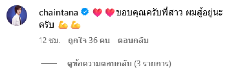 แม่ใหม่เชื่อว่า ถ้าคนๆนี้กลับมาฟื้นชีวิตได้ เขาจะเก่งมากๆเลย เพราะเขาสู้แบบสุดตัว สู้แบบไม่ยอมท้อถอยเลยจริงๆ (แม่ไม่ได้มีส่วนเกี่ยวข้องกับเรื่องราวของพี่เชนด้วยนะคะ แต่ช่วงนึง พี่เชนเคยมีบุญคุณกับชีวิตของแม่ค่ะ) ต่อมาทางด้าน เชน ธนา ได้เข้ามาตอบกลับโพสต์ทันทีว่า ขอบคุณครับพี่สาว ผมสู้อยู่นะครับ